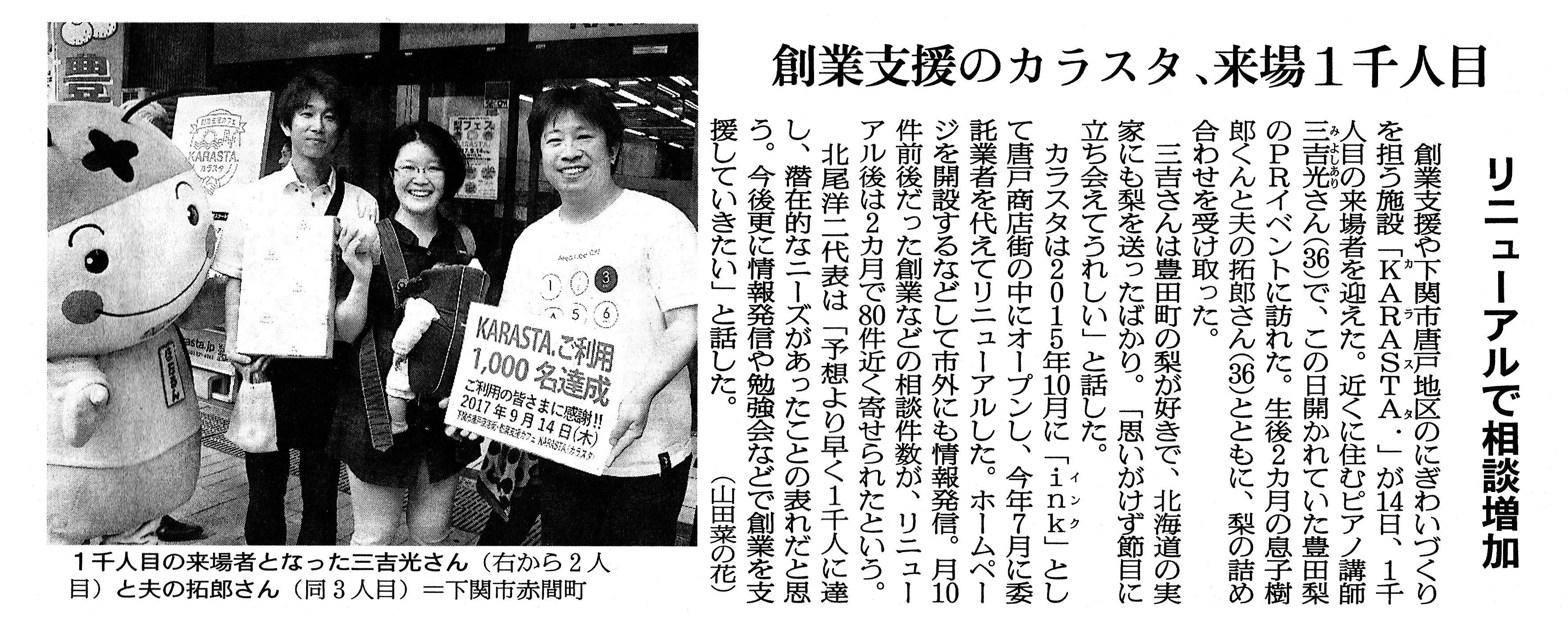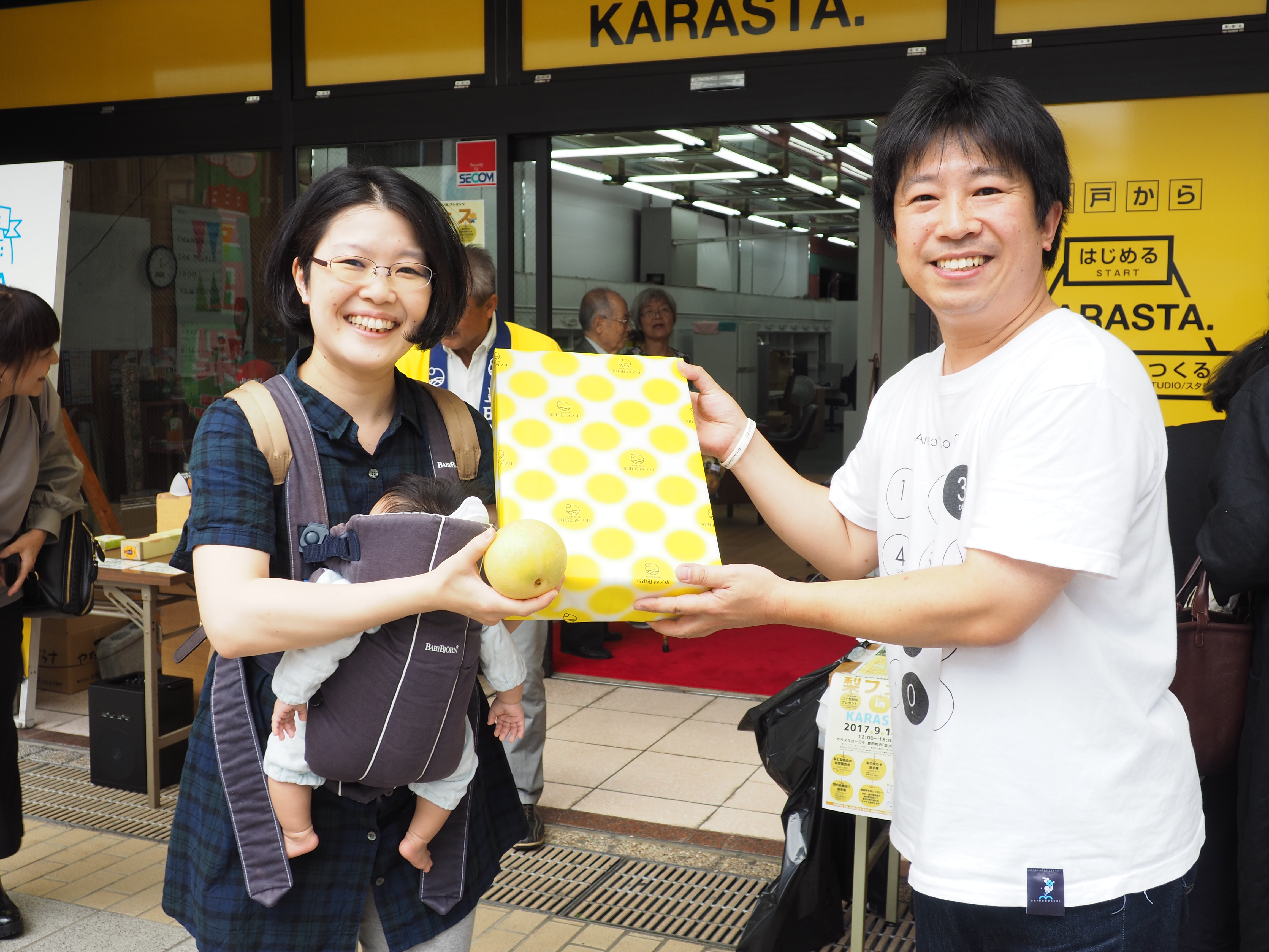 1,000人目は、下関十字堂楽器店の三吉さんご家族(三吉光さん/みよし あり、三吉拓郎さん)。記念品として、弊社代表の北尾洋二(代表取締役/カラスタ インキュベーションマネージャー)より、道の駅蛍街道西ノ市の下関産「豊田梨」詰め合わせを贈呈させて頂きました。
